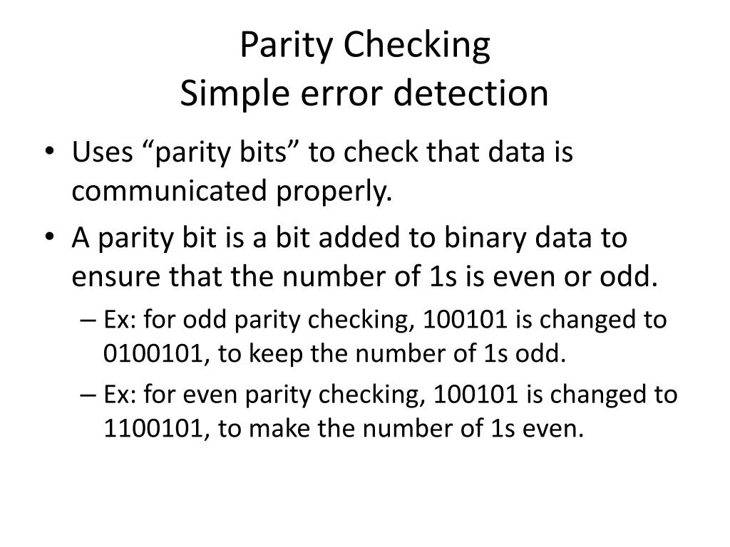 Parity CheckingSimple error detection • Uses “parity bits” to check that data is communicated properly. • A parity bit is a bit added to binary data to ensure that the number of 1s is even or odd. • Ex: for odd parity checking, 100101 is changed to 0100101, to keep the number of 1s odd. • Ex: for even parity checking, 100101 is changed to 1100101, to make the number of 1s even.