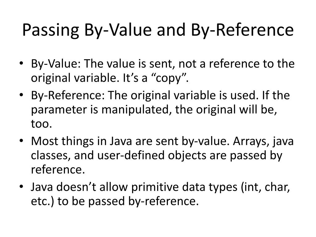 Passing By-Value and By-Reference • By-Value: The value is sent, not a reference to the original variable. It’s a “copy”. • By-Reference: The original variable is used. If the parameter is manipulated, the original will be, too. • Most things in Java are sent by-value. Arrays, java classes, and user-defined objects are passed by reference. • Java doesn’t allow primitive data types (int, char, etc.) to be passed by-reference.
