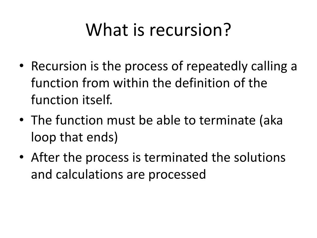 What is recursion? • Recursion is the process of repeatedly calling a function from within the definition of the function itself. • The function must be able to terminate (aka loop that ends) • After the process is terminated the solutions and calculations are processed