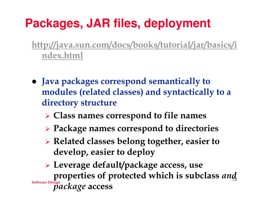 Packages, JAR files, deployment http://java.sun.com/docs/books/tutorial/jar/basics/index.html • Java packages correspond semantically to modules (related classes) and syntactically to a directory structure • Class names correspond to file names • Package names correspond to directories • Related classes belong together, easier to develop, easier to deploy • Leverage default/package access, use properties of protected which is subclass and package access