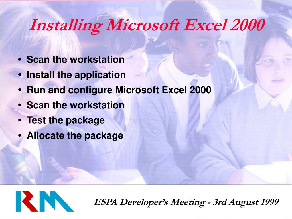 Installing Microsoft Excel 2000 • Scan the workstation • Install the application • Run and configure Microsoft Excel 2000 • Scan the workstation • Test the package • Allocate the package