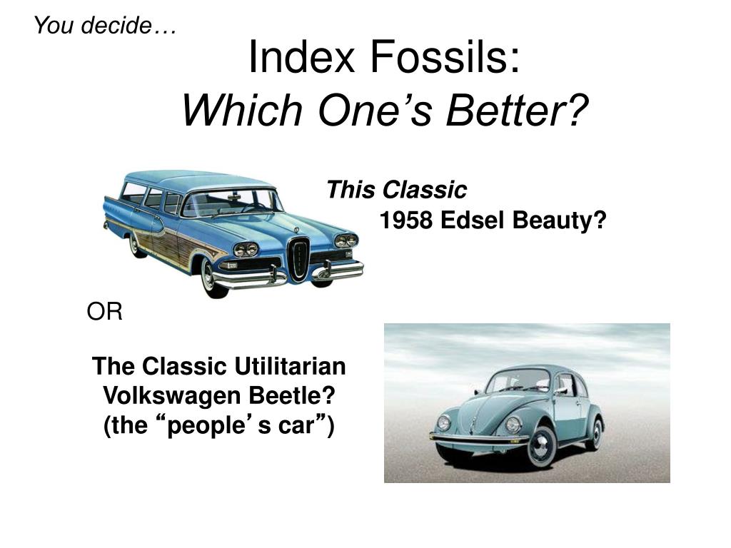 You decide… Index Fossils:Which One’s Better? ThisClassic 1958 Edsel Beauty? OR The Classic Utilitarian Volkswagen Beetle? (the “people’s car”)