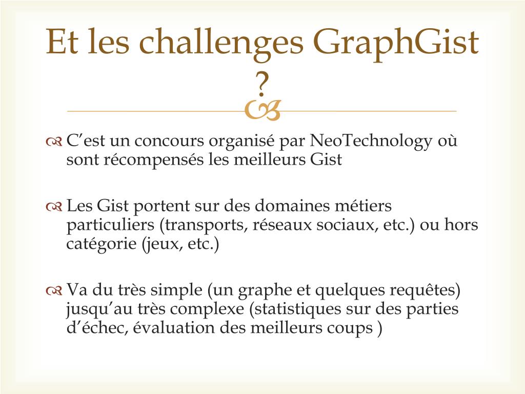 Et les challenges GraphGist ? • C’est un concours organisé par NeoTechnology où sont récompensés les meilleurs Gist • Les Gist portent sur des domaines métiers particuliers (transports, réseaux sociaux, etc.) ou hors catégorie (jeux, etc.) • Va du très simple (un graphe et quelques requêtes) jusqu’au très complexe (statistiques sur des parties d’échec, évaluation des meilleurs coups )