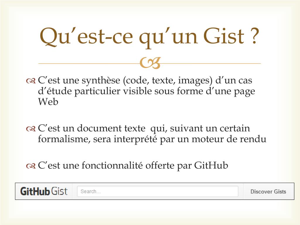 Qu’est-ce qu’un Gist ? • C’est une synthèse (code, texte, images) d’un cas d’étude particulier visible sous forme d’une page Web • C’est un document texte qui, suivant un certain formalisme, sera interprété par un moteur de rendu • C’est une fonctionnalité offerte par GitHub