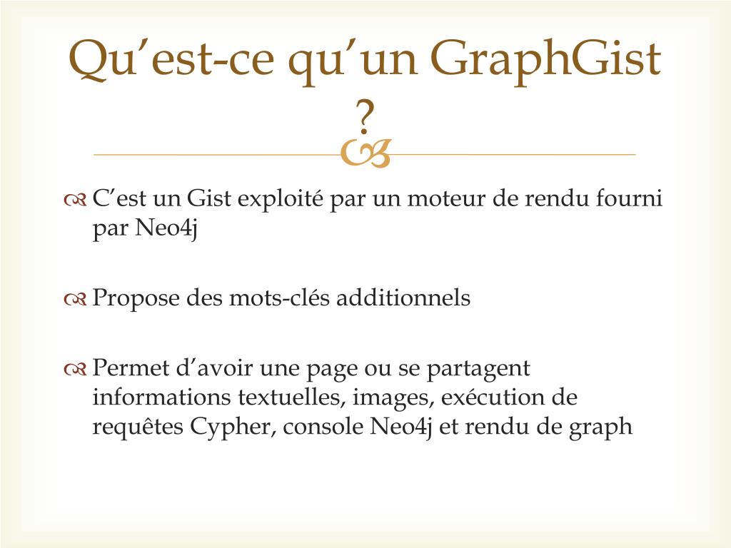 Qu’est-ce qu’un GraphGist ? • C’est un Gist exploité par un moteur de rendu fourni par Neo4j • Propose des mots-clés additionnels • Permet d’avoir une page ou se partagent informations textuelles, images, exécution de requêtes Cypher, console Neo4j et rendu de graph