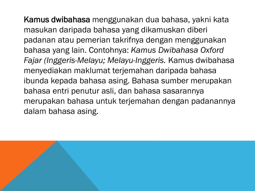 Ciri2- • Kata entri- • 1. Kata masukanutamamerupakan kata tunggal, • Kumpulan perkataan, singkatan,awalan, akhiranataubentuk2. bergabung-kata masukanutamaditandaihuruftebaldandiletakkan di jedaterkirilajur • 3. Tidakmenghuraikanmakna kata tetapimenyediakanpadananbahasabahasaMelayubagisetiapperkataan, frasadanungkapanbahasaInggeris. • 4. Ada bezaanmaknaygdikenaliygdisebutsebagaiglos-bolehberupasinonim, frasa, takriflengkap ,label catatantatbahasa – penerangan yang lebihjelaskepada kata entri