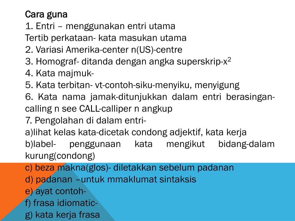 Cara guna • 1. Entri– menggunakanentriutama • Tertibperkataan- kata masukanutama • 2. VariasiAmerika-center n(US)-centre • 3. Homograf- ditandadenganangka superskrip-x2 • 4. Kata majmuk- • 5. Kata terbitan- vt-contoh-siku-menyiku, menyigung • 6. Kata namajamak-ditunjukkandalamentriberasingan- calling n see CALL-calliper n angkup • 7. Pengolahandi dalamentri- • a)lihatkelas kata-dicetakcondongadjektif, kata kerja • b)label- penggunaan kata mengikutbidang-dalamkurung(condong) • c) bezamakna(glos)- diletakkansebelumpadanan • d) padanan –untukmmaklumatsintaksis • e) ayatcontoh- • f) frasa idiomatic- • g) kata kerjafrasa