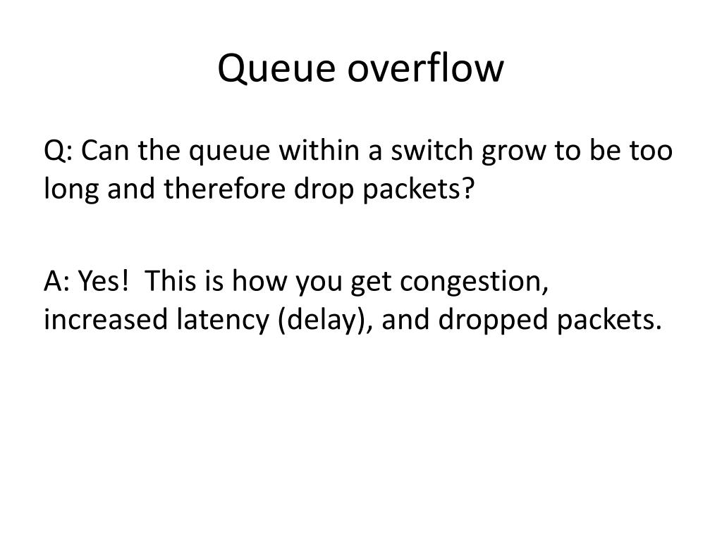 Queue overflow Q: Can the queue within a switch grow to be too long and therefore drop packets? A: Yes! This is how you get congestion, increased latency (delay), and dropped packets.