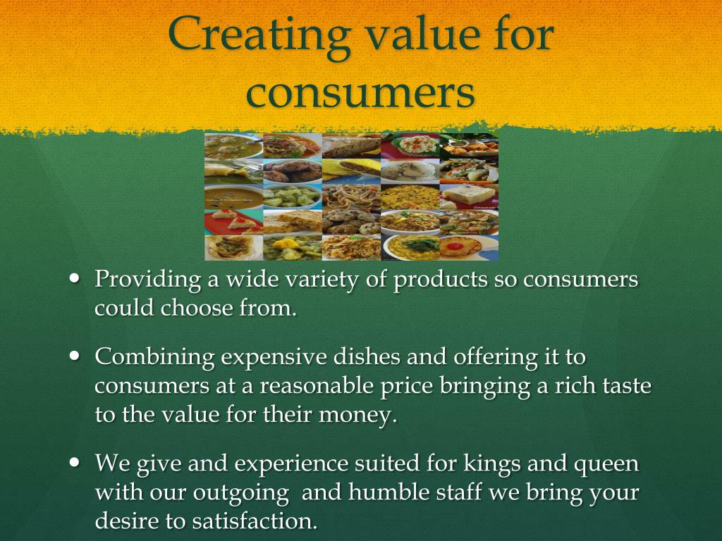 Creating value for consumers • Providing a wide variety of products so consumers could choose from. • Combining expensive dishes and offering it to consumers at a reasonable price bringing a rich taste to the valuefortheir money. • We give and experience suited for kings and queen with our outgoing and humble staff we bring your desire to satisfaction.