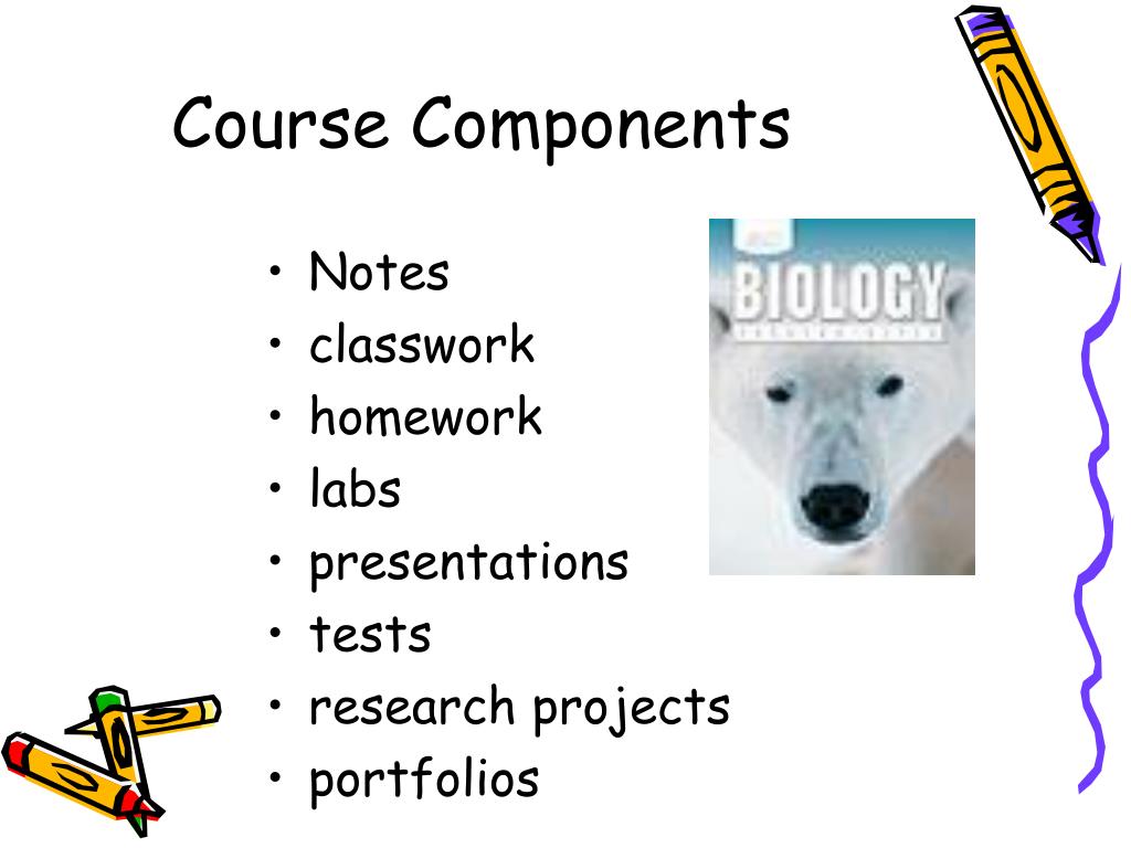 Course Components • Notes • classwork • homework • labs • presentations • tests • research projects • portfolios