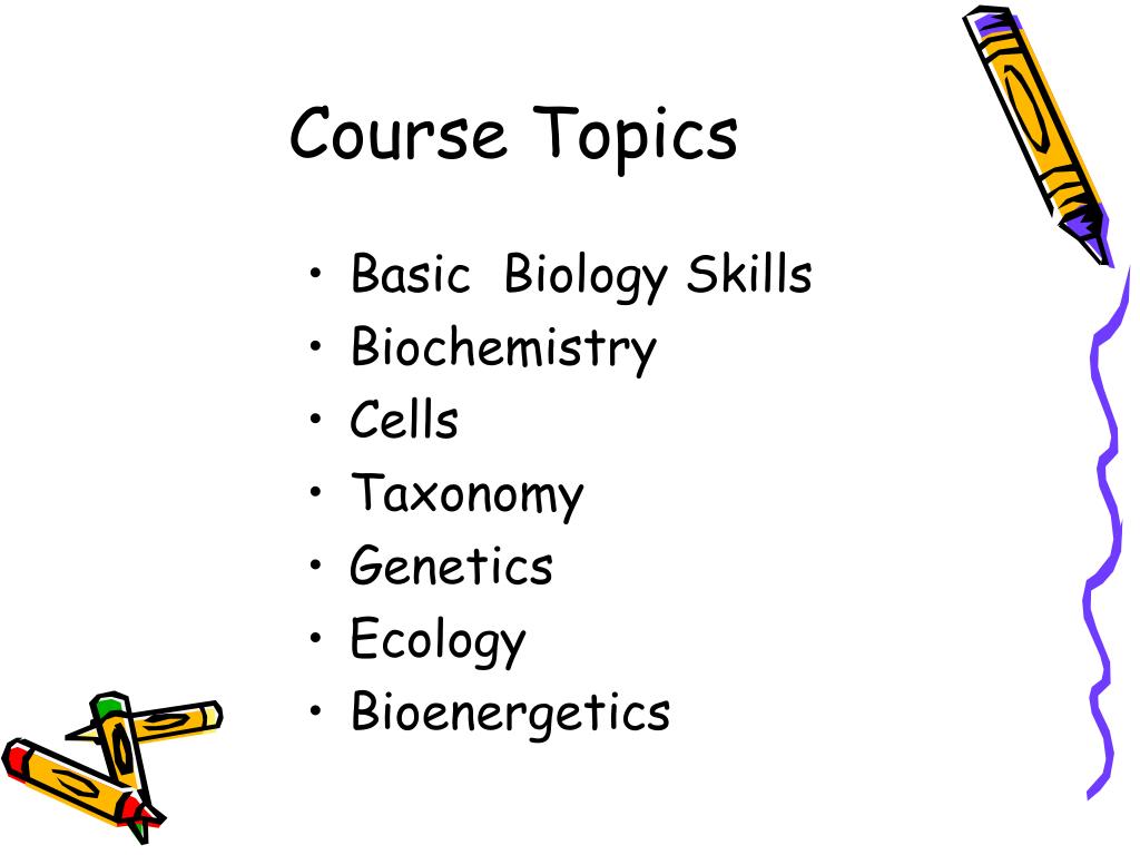 Course Topics • Basic Biology Skills • Biochemistry • Cells • Taxonomy • Genetics • Ecology • Bioenergetics