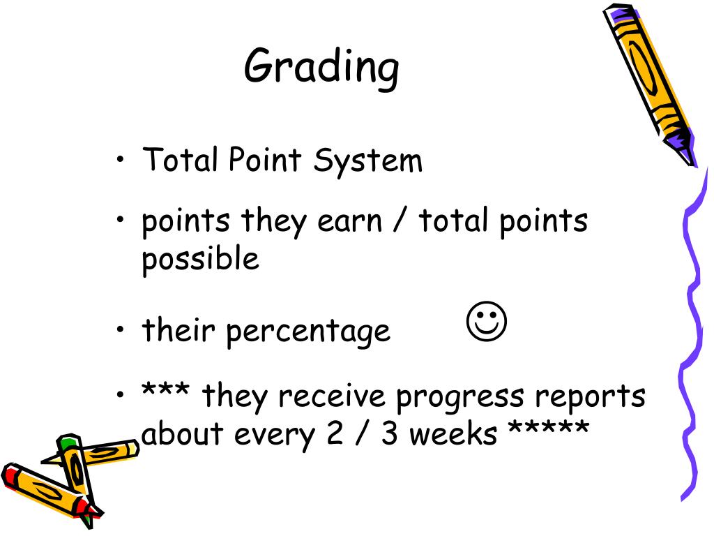 Grading • Total Point System • points they earn / total points possible • their percentage • *** they receive progress reports about every 2 / 3 weeks *****