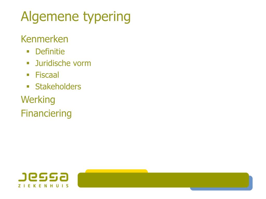 Algemene typering Kenmerken • Definitie • Juridische vorm • Fiscaal • Stakeholders Werking Financiering