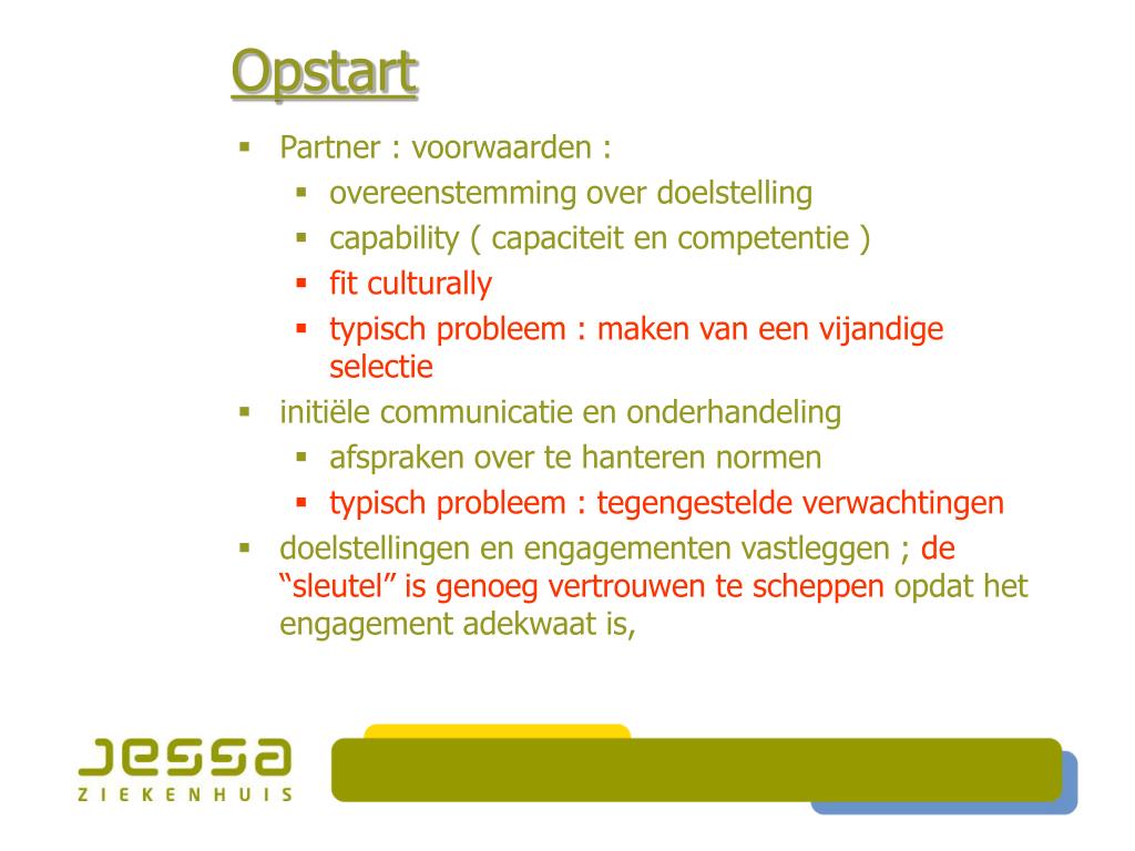 Opstart • Partner : voorwaarden : • overeenstemming over doelstelling • capability ( capaciteit en competentie ) • fit culturally • typisch probleem : maken van een vijandige selectie • initiële communicatie en onderhandeling • afspraken over te hanteren normen • typisch probleem : tegengestelde verwachtingen • doelstellingen en engagementen vastleggen ; de “sleutel” is genoeg vertrouwen te scheppen opdat het engagement adekwaat is,