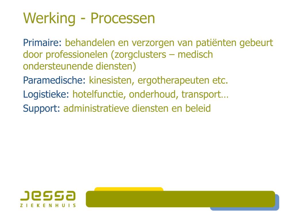 Werking - Processen Primaire: behandelen en verzorgen van patiënten gebeurt door professionelen (zorgclusters – medisch ondersteunende diensten) Paramedische: kinesisten, ergotherapeuten etc. Logistieke: hotelfunctie, onderhoud, transport… Support: administratieve diensten en beleid