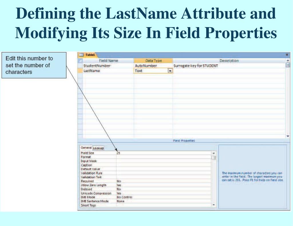 Defining the LastName Attribute and Modifying Its Size In Field Properties