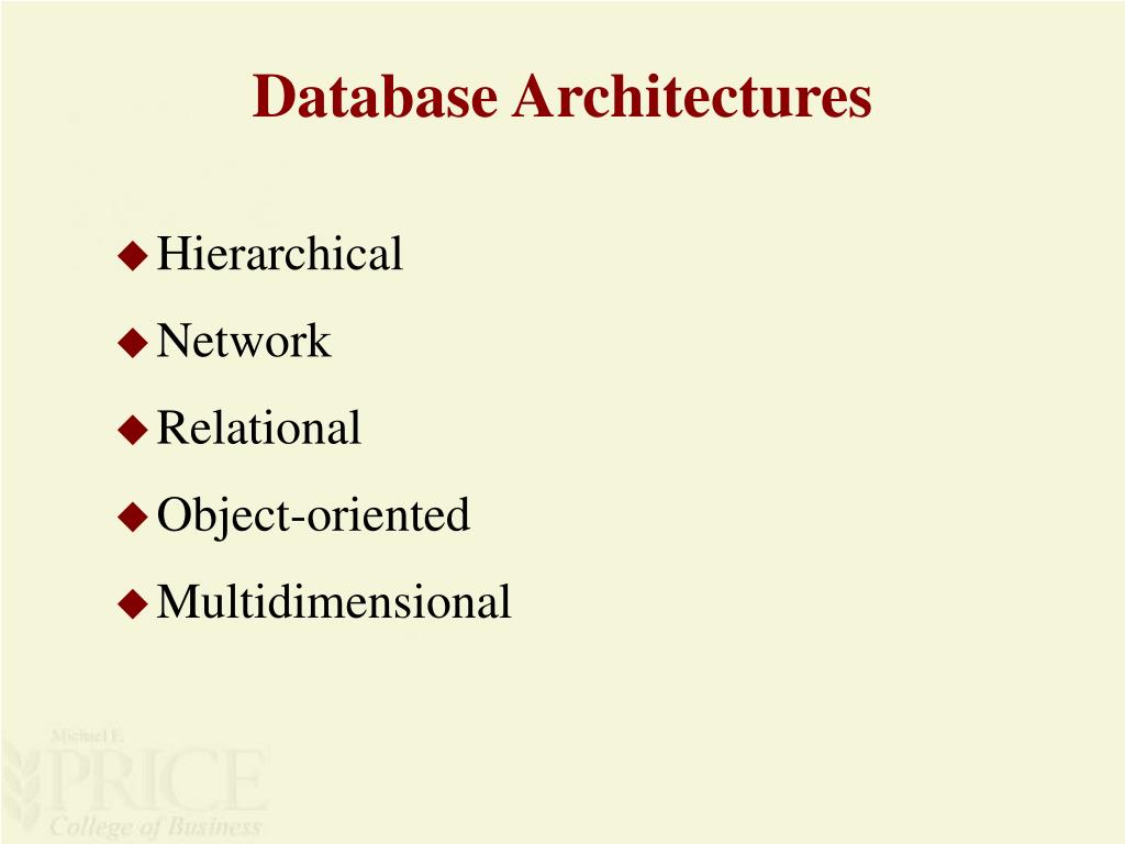 Database Architectures • Hierarchical • Network • Relational • Object-oriented • Multidimensional