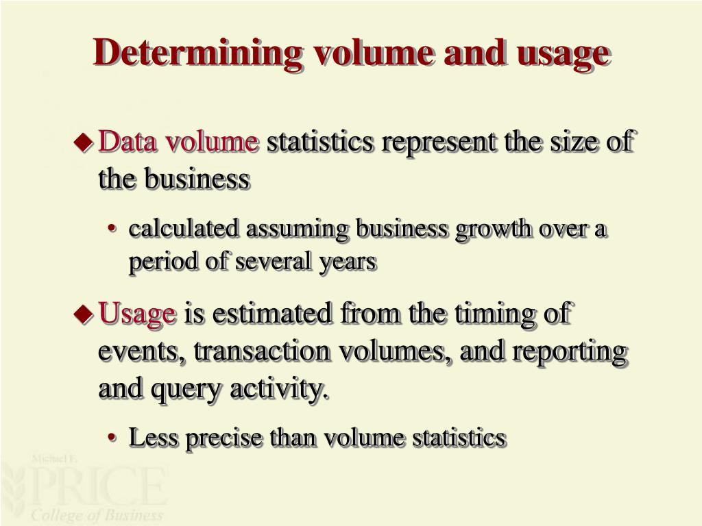 Determining volume and usage • Data volume statistics represent the size of the business • calculated assuming business growth over a period of several years • Usage is estimated from the timing of events, transaction volumes, and reporting and query activity. • Less precise than volume statistics