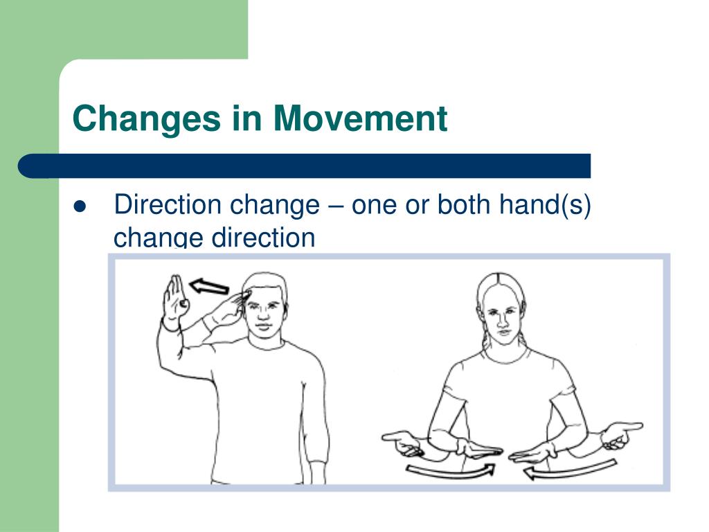 Change in Movement • Hand shape change – one or both hand(s) change hand shape in mid-sign