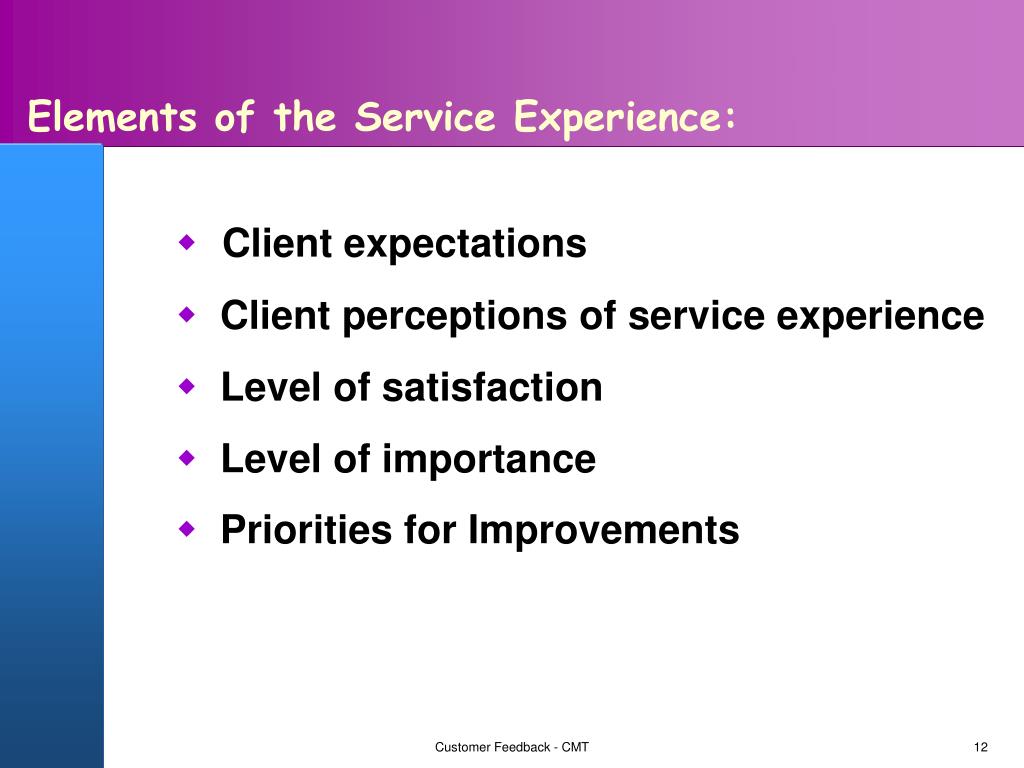 Elements of the Service Experience: • Client expectations • Client perceptions of service experience • Level of satisfaction • Level of importance • Priorities for Improvements Customer Feedback - CMT