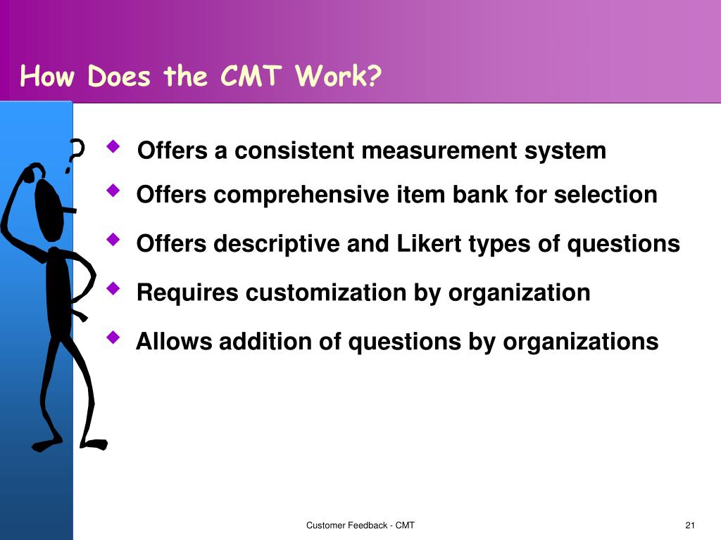 How Does the CMT Work? • Offers a consistent measurement system • Offers comprehensive item bank for selection • Offers descriptive and Likert types of questions • Requires customization by organization • Allows addition of questions by organizations Customer Feedback - CMT