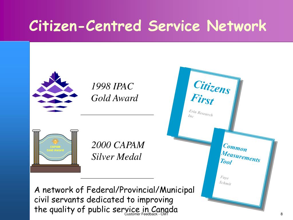 Citizens First Erin Research Inc Citizen-Centred ServiceNetwork 1998 IPACGold Award Common Measurements Tool 2000 CAPAMSilver Medal Faye Schmit A network of Federal/Provincial/Municipal civil servants dedicated to improving the quality of public service in Canada Customer Feedback - CMT