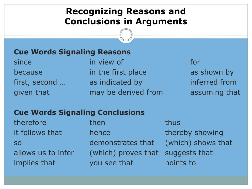 Recognizing Reasons and Conclusions in Arguments Cue Words Signaling Reasons since in view of for because in the first place as shown by first, second … as indicated by inferred from given that may be derived from assuming that Cue Words Signaling Conclusions therefore then thus it follows that hence thereby showing so demonstrates that (which) shows that allows us to infer (which) proves that suggests that implies that you see that points to
