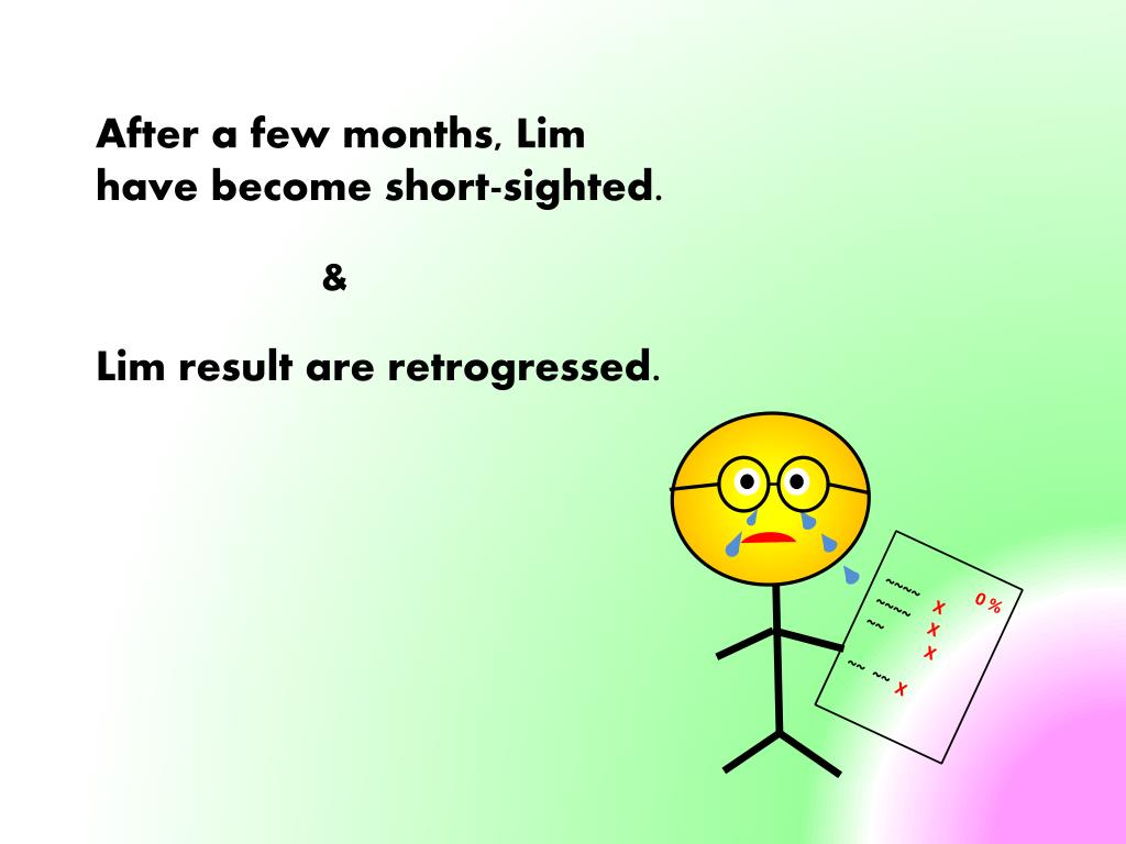 After a few months, Lim have become short-sighted. & Lim result are retrogressed. 0 % ~~~~ X ~~~~ X ~~ X ~~ ~~ X