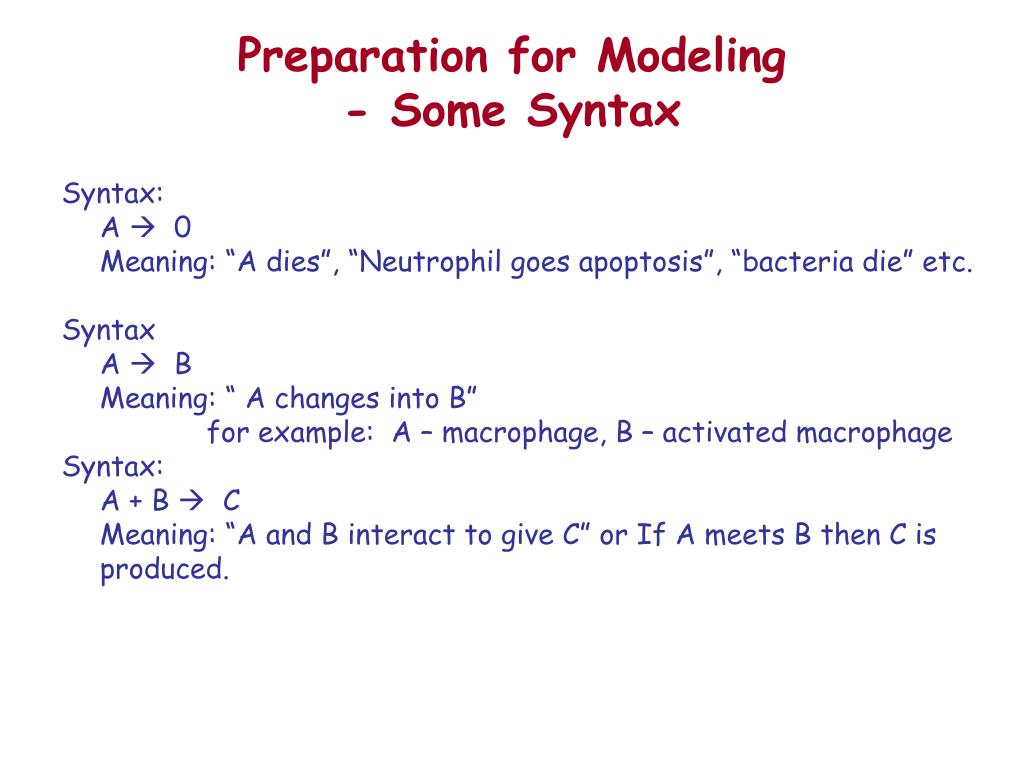 Preparation for Modeling - Some Syntax Syntax: A 0 Meaning: “A dies”, “Neutrophil goes apoptosis”, “bacteria die” etc. Syntax A B Meaning: “ A changes into B” for example: A – macrophage, B – activated macrophage Syntax: A + B C Meaning: “A and B interact to give C” or If A meets B then C is produced.