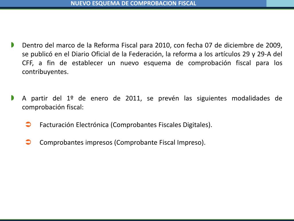 NUEVO ESQUEMA DE COMPROBACION FISCAL • Dentro del marco de la Reforma Fiscal para 2010, con fecha 07 de diciembre de 2009, se publicó en el Diario Oficial de la Federación, la reforma a los artículos 29 y 29-A del CFF, a fin de establecer un nuevo esquema de comprobación fiscal para los contribuyentes. • A partir del 1º de enero de 2011, se prevén las siguientes modalidades de comprobación fiscal: • Facturación Electrónica (Comprobantes Fiscales Digitales). • Comprobantes impresos (Comprobante Fiscal Impreso).