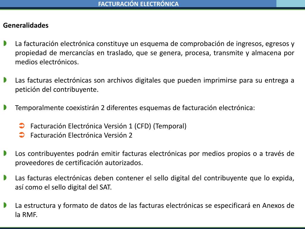 FACTURACIÓN ELECTRÓNICA • Generalidades • La facturación electrónica constituye un esquema de comprobación de ingresos, egresos y propiedad de mercancías en traslado, que se genera, procesa, transmite y almacena por medios electrónicos. • Las facturas electrónicas son archivos digitales que pueden imprimirse para su entrega a petición del contribuyente. • Temporalmente coexistirán 2 diferentes esquemas de facturación electrónica: • Facturación Electrónica Versión 1 (CFD) (Temporal) • Facturación Electrónica Versión 2 • Los contribuyentes podrán emitir facturas electrónicas por medios propios o a través de proveedores de certificación autorizados. • Las facturas electrónicas deben contener el sello digital del contribuyente que lo expida, así como el sello digital del SAT. • La estructura y formato de datos de las facturas electrónicas se especificará en Anexos de la RMF.