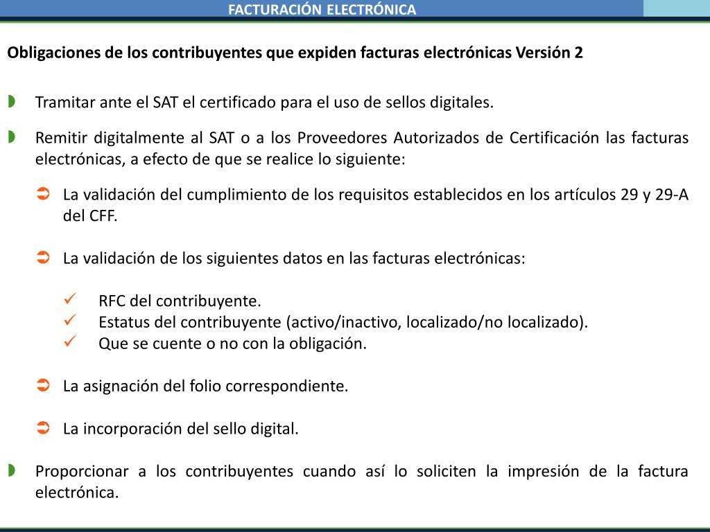 FACTURACIÓNELECTRÓNICA • Obligaciones de los contribuyentes que expiden facturas electrónicas Versión 2 • Tramitar ante el SAT el certificado para el uso de sellos digitales. • Remitir digitalmente al SAT o a los Proveedores Autorizados de Certificación las facturas electrónicas, a efecto de que se realice lo siguiente: • La validación del cumplimiento de los requisitos establecidos en los artículos 29 y 29-A del CFF. • La validación de los siguientes datos en las facturas electrónicas: • RFC del contribuyente. • Estatus del contribuyente (activo/inactivo, localizado/no localizado). • Que se cuente o no con la obligación. • La asignación del folio correspondiente. • La incorporación del sello digital. • Proporcionar a los contribuyentes cuando así lo soliciten la impresión de la factura electrónica.