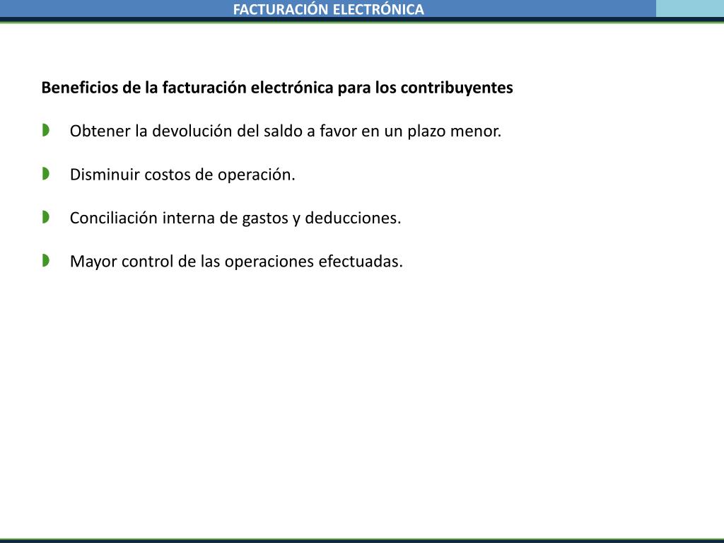 FACTURACIÓN ELECTRÓNICA • Beneficios de la facturación electrónica para los contribuyentes • Obtener la devolución del saldo a favor en un plazo menor. • Disminuir costos de operación. • Conciliación interna de gastos y deducciones. • Mayor control de las operaciones efectuadas.