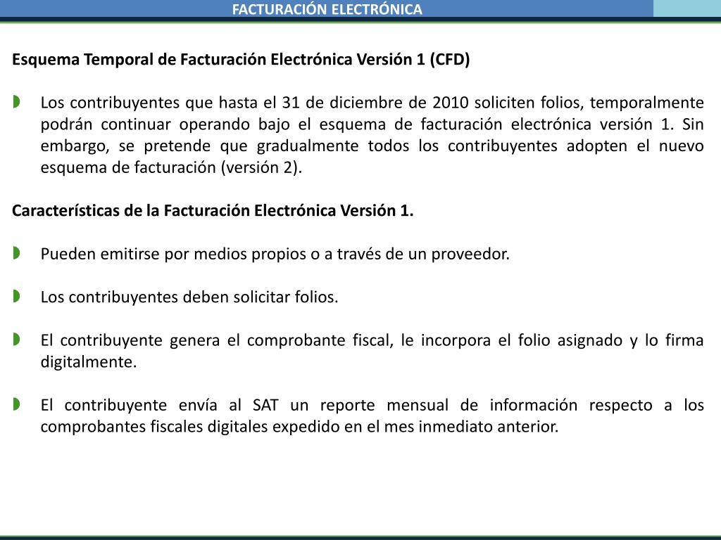 FACTURACIÓN ELECTRÓNICA • Esquema Temporal de Facturación Electrónica Versión 1 (CFD) • Los contribuyentes que hasta el 31 de diciembre de 2010 soliciten folios, temporalmente podrán continuar operando bajo el esquema de facturación electrónica versión 1. Sin embargo, se pretende que gradualmente todos los contribuyentes adopten el nuevo esquema de facturación (versión 2). • Características de la Facturación Electrónica Versión 1. • Pueden emitirse por medios propios o a través de un proveedor. • Los contribuyentes deben solicitar folios. • El contribuyente genera el comprobante fiscal, le incorpora el folio asignado y lo firma digitalmente. • El contribuyente envía al SAT un reporte mensual de información respecto a los comprobantes fiscales digitales expedido en el mes inmediato anterior.