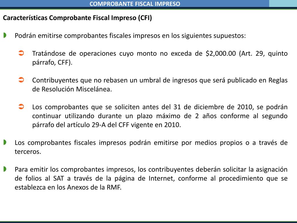 COMPROBANTE FISCAL IMPRESO • Características Comprobante Fiscal Impreso (CFI) • Podrán emitirse comprobantes fiscales impresos en los siguientes supuestos: • Tratándose de operaciones cuyo monto no exceda de $2,000.00 (Art. 29, quinto párrafo, CFF). • Contribuyentes que no rebasen un umbral de ingresos que será publicado en Reglas de Resolución Miscelánea. • Los comprobantes que se soliciten antes del 31 de diciembre de 2010, se podrán continuar utilizando durante un plazo máximo de 2 años conforme al segundo párrafo del artículo 29-A del CFF vigente en 2010. • Los comprobantes fiscales impresos podrán emitirse por medios propios o a través de terceros. • Para emitir los comprobantes impresos, los contribuyentes deberán solicitar la asignación de folios al SAT a través de la página de Internet, conforme al procedimiento que se establezca en los Anexos de la RMF.