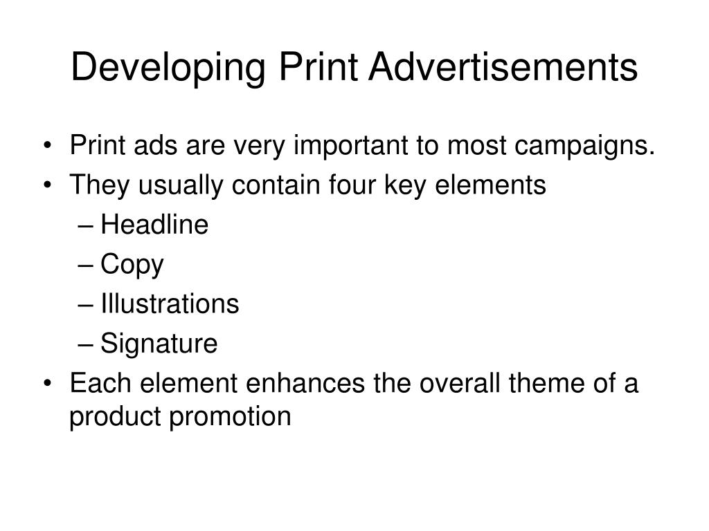 Developing Print Advertisements • Print ads are very important to most campaigns. • They usually contain four key elements • Headline • Copy • Illustrations • Signature • Each element enhances the overall theme of a product promotion