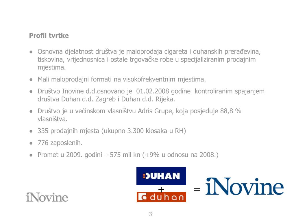 Profil tvrtke • Osnovna djelatnost društva je maloprodaja cigareta i duhanskih prerađevina, tiskovina, vrijednosnica i ostale trgovačke robe u specijaliziranim prodajnim mjestima. • Mali maloprodajni formati na visokofrekventnim mjestima. • Društvo Inovine d.d.osnovano je 01.02.2008 godine kontroliranim spajanjem društva Duhan d.d. Zagreb i Duhan d.d. Rijeka. • Društvo je u većinskom vlasništvu Adris Grupe, koja posjeduje 88,8 % vlasništva. • 335 prodajnih mjesta (ukupno 3.300 kiosaka u RH) • 776 zaposlenih. • Promet u 2009. godini – 575 mil kn (+9% u odnosu na 2008.) + =