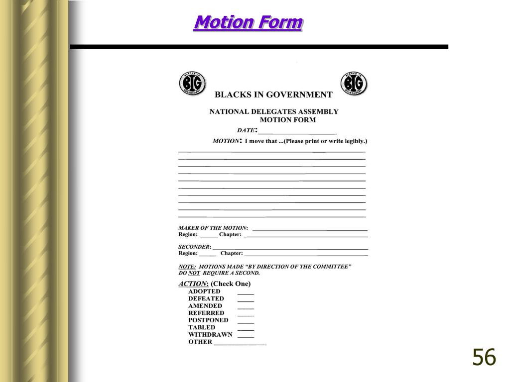 Standing Rules of the Delegates Assembly (Cont.) 14. All electronic devices (Blackberries, Cellular Phones, Computers with Music or Chimes, and Pagers) shall be turned off or placed on vibrate or silent while the Delegates Assembly is in session. 15. Any copies of reports or informational materials that need to be distributed to the Delegates in session will be retrieved by each Region’s Sergeant-at-Arms. 16. Delegates are requested to abide by all of the above for order and decorum. 55