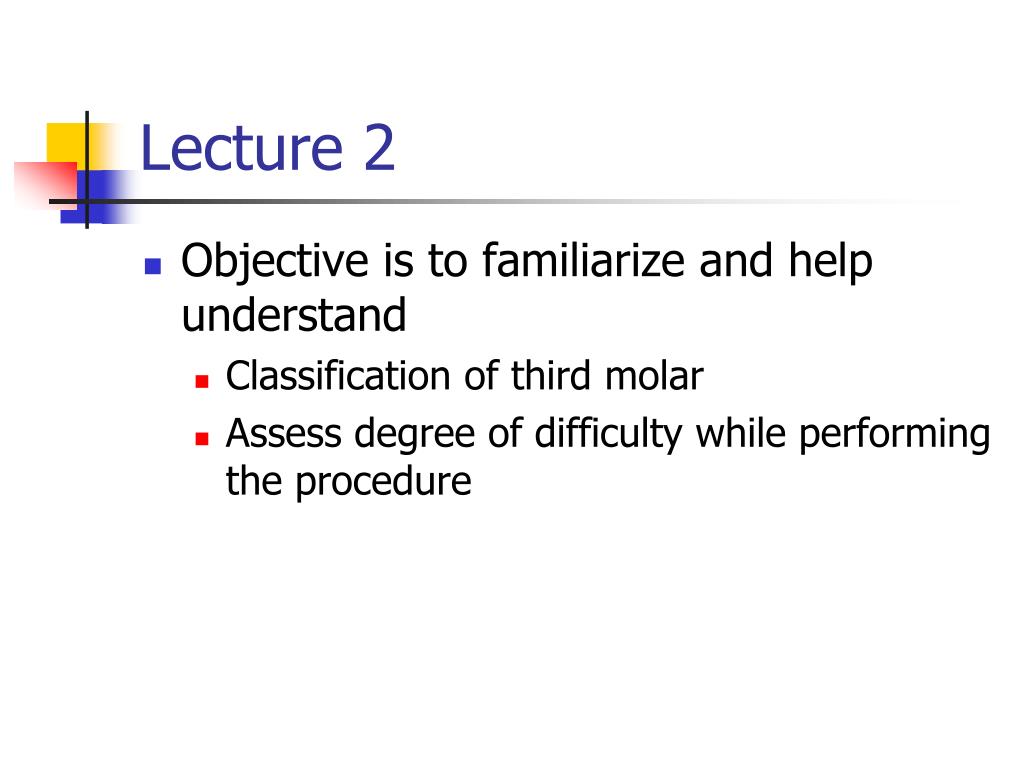 Lecture 2 • Objective is to familiarize and help understand • Classification of third molar • Assess degree of difficulty while performing the procedure