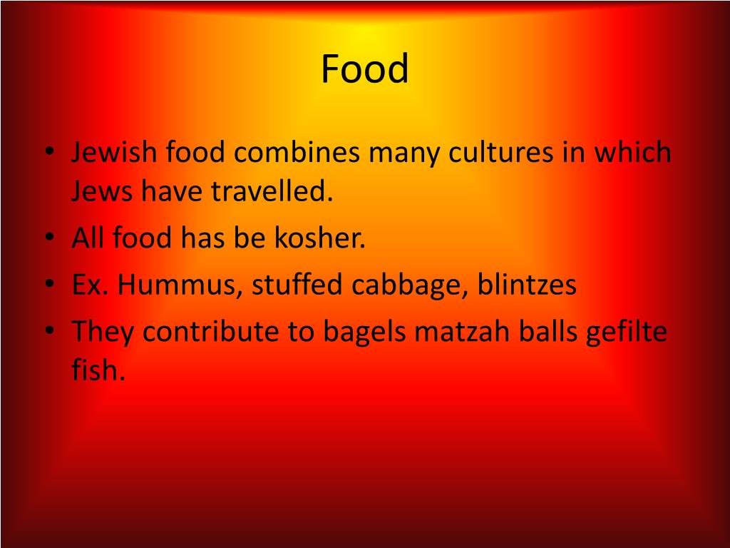 Food • Jewish food combines many cultures in which Jews have travelled. • All food has be kosher. • Ex. Hummus, stuffed cabbage, blintzes • They contribute to bagels matzah balls gefilte fish.