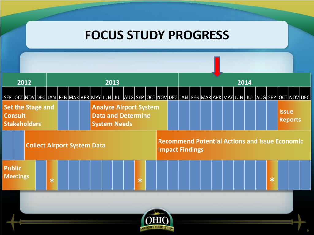 Focus Study Purpose and Goals “The Focus Study will be used to optimize investment in Ohio’s airport system with an eye toward safety,efficiency and economic growth. It will identify needed system improvements, develop a framework for prioritizing those projects, and assess the economic impact of each publicly owned airport. The Study’s findings will assist ODOT and FAA in making hard decisions on proposed airport development in a period of limited funding.”