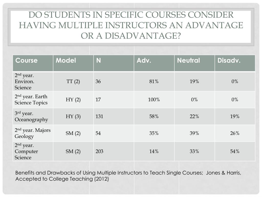 Do students in specific courses consider having multiple instructors an advantage or a disadvantage? Benefits and Drawbacks of Using Multiple Instructors to Teach Single Courses; Jones & Harris, Accepted to College Teaching (2012)