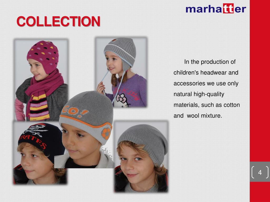 COLLECTION In the production of children's headwear and accessories we use only natural high-quality materials, such as cottonand wool mixture.