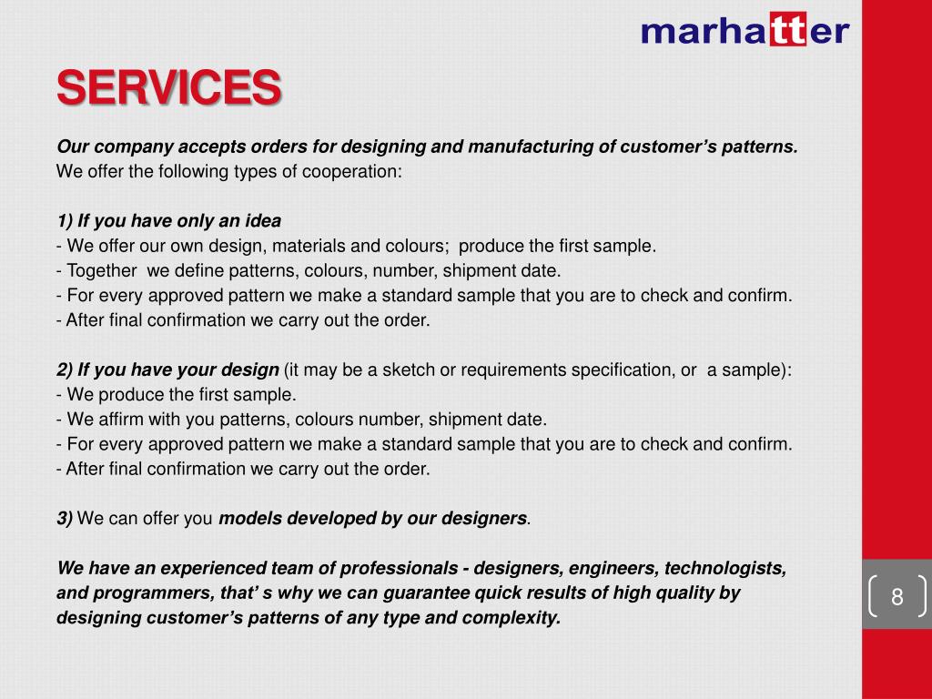 SERVICES Our company accepts orders for designing and manufacturing of customer’s patterns.We offer the following types of cooperation: 1) If you have only an idea - We offer our own design, materials and colours; produce the first sample. - Together we define patterns, colours, number, shipmentdate.- For every approved pattern we make a standard sample that you are to check and confirm. - After final confirmation we carry out the order. 2) If you have your design (it may be a sketch or requirements specification, or a sample): - We produce the first sample. - We affirm with you patterns, colours number, shipment date. - For every approved pattern we make a standard sample that you are to check and confirm.- After final confirmation we carry out the order. 3)We can offer you models developed by our designers. We have an experienced team of professionals - designers, engineers, technologists, and programmers, that’ s why we can guarantee quick results of high quality by designing customer’s patterns of any type and complexity.