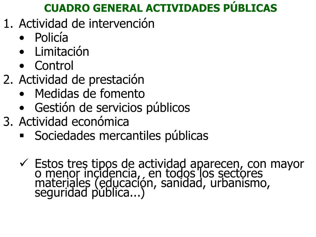 CUADRO GENERAL ACTIVIDADES PÚBLICAS • Actividad de intervención • Policía • Limitación • Control • Actividad de prestación • Medidas de fomento • Gestión de servicios públicos • Actividad económica • Sociedades mercantiles públicas • Estos tres tipos de actividad aparecen, con mayor o menor incidencia, en todos los sectores materiales (educación, sanidad, urbanismo, seguridad pública...)