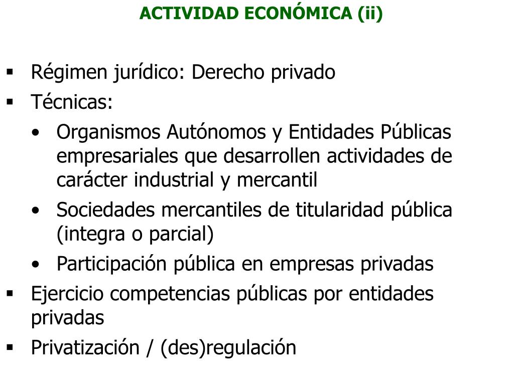 ACTIVIDAD ECONÓMICA (ii) • Régimen jurídico: Derecho privado • Técnicas: • Organismos Autónomos y Entidades Públicas empresariales que desarrollen actividades de carácter industrial y mercantil • Sociedades mercantiles de titularidad pública (integra o parcial) • Participación pública en empresas privadas • Ejercicio competencias públicas por entidades privadas • Privatización / (des)regulación