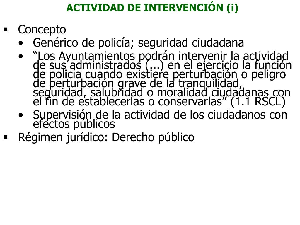 ACTIVIDAD DE INTERVENCIÓN (i) • Concepto • Genérico de policía; seguridad ciudadana • “Los Ayuntamientos podrán intervenir la actividad de sus administrados (...) en el ejercicio la función de policía cuando existiere perturbación o peligro de perturbación grave de la tranquilidad, seguridad, salubridad o moralidad ciudadanas con el fin de establecerlas o conservarlas” (1.1 RSCL) • Supervisión de la actividad de los ciudadanos con efectos públicos • Régimen jurídico: Derecho público