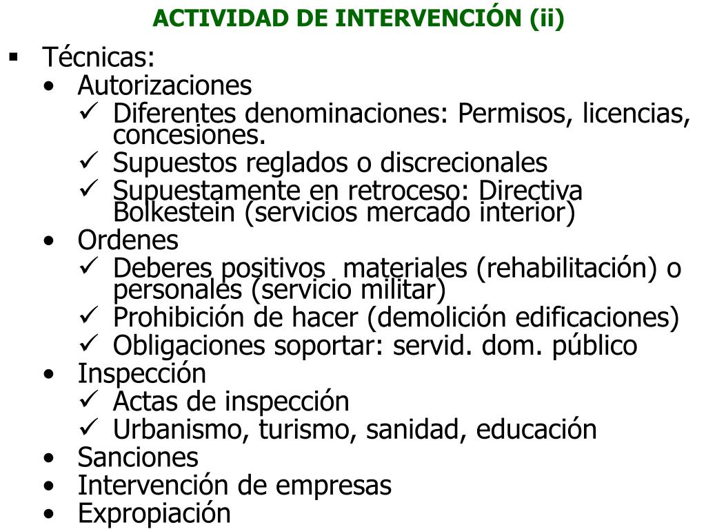 ACTIVIDAD DE INTERVENCIÓN (ii) • Técnicas: • Autorizaciones • Diferentes denominaciones: Permisos, licencias, concesiones. • Supuestos reglados o discrecionales • Supuestamente en retroceso: Directiva Bolkestein (servicios mercado interior) • Ordenes • Deberes positivos materiales (rehabilitación) o personales (servicio militar) • Prohibición de hacer (demolición edificaciones) • Obligaciones soportar: servid. dom. público • Inspección • Actas de inspección • Urbanismo, turismo, sanidad, educación • Sanciones • Intervención de empresas • Expropiación