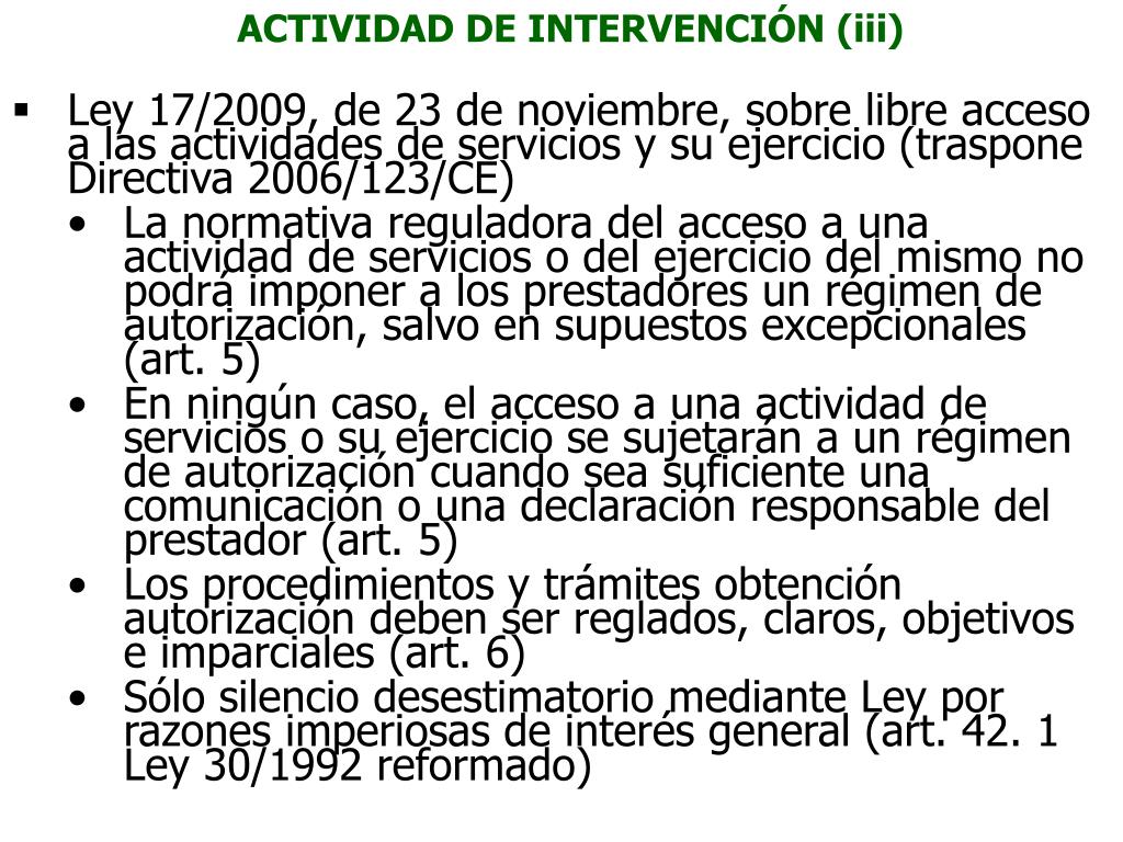 ACTIVIDAD DE INTERVENCIÓN (iii) • Ley 17/2009, de 23 de noviembre, sobre libre acceso a las actividades de servicios y su ejercicio (traspone Directiva 2006/123/CE) • La normativa reguladora del acceso a una actividad de servicios o del ejercicio del mismo no podrá imponer a los prestadores un régimen de autorización, salvo en supuestos excepcionales (art. 5) • En ningún caso, el acceso a una actividad de servicios o su ejercicio se sujetarán a un régimen de autorización cuando sea suficiente una comunicación o una declaración responsable del prestador (art. 5) • Los procedimientos y trámites obtención autorización deben ser reglados, claros, objetivos e imparciales (art. 6) • Sólo silencio desestimatorio mediante Ley por razones imperiosas de interés general (art. 42. 1 Ley 30/1992 reformado)