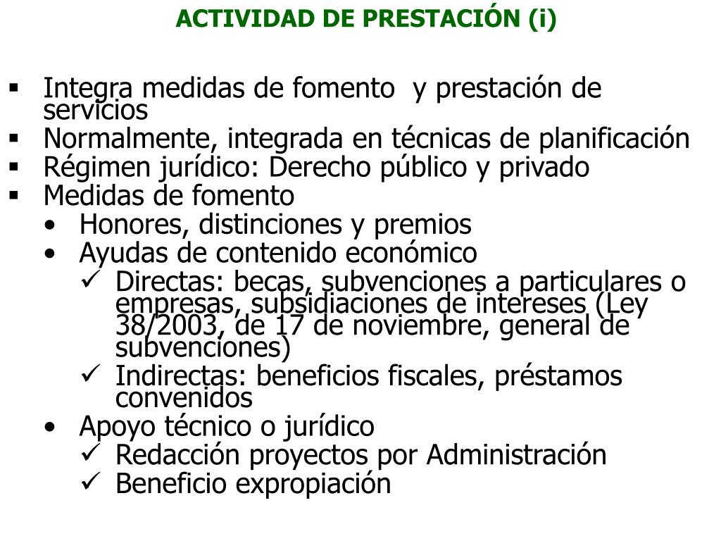 ACTIVIDAD DE PRESTACIÓN (i) • Integra medidas de fomento y prestación de servicios • Normalmente, integrada en técnicas de planificación • Régimen jurídico: Derecho público y privado • Medidas de fomento • Honores, distinciones y premios • Ayudas de contenido económico • Directas: becas, subvenciones a particulares o empresas, subsidiaciones de intereses (Ley 38/2003, de 17 de noviembre, general de subvenciones) • Indirectas: beneficios fiscales, préstamos convenidos • Apoyo técnico o jurídico • Redacción proyectos por Administración • Beneficio expropiación